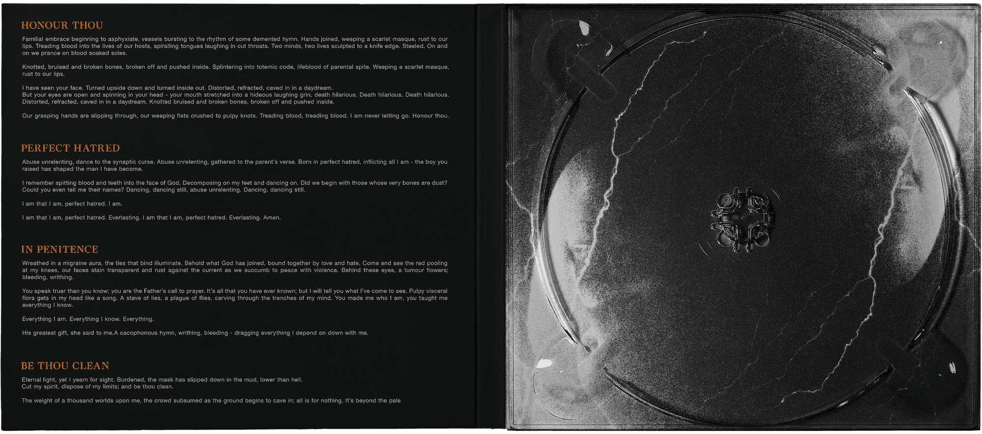 Layout and subsequent artworks for two physical products; a Digipack wallet and blackened CD, cassette tapes with on-body printing and a 4-panel insert, and a supporting merchandise design.
