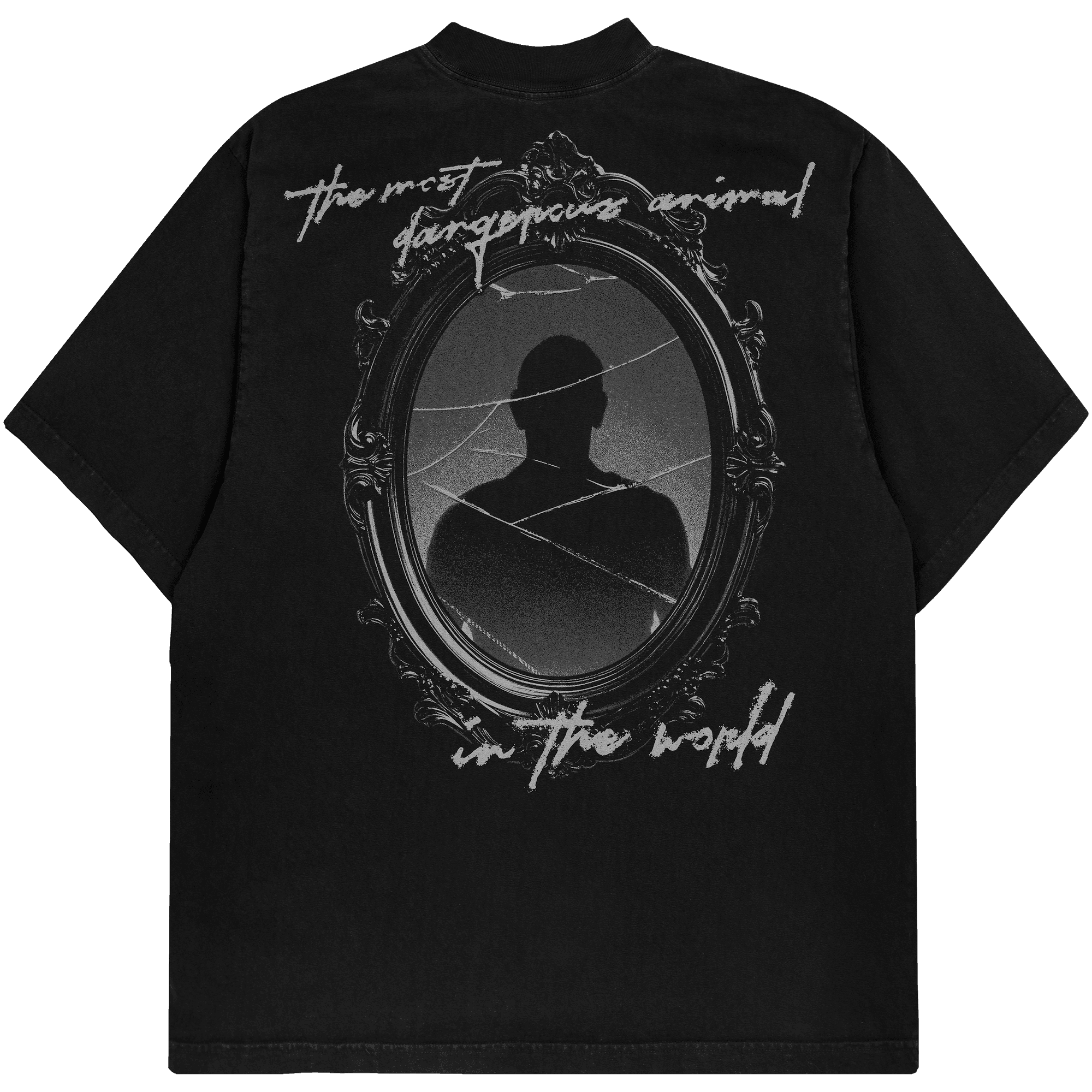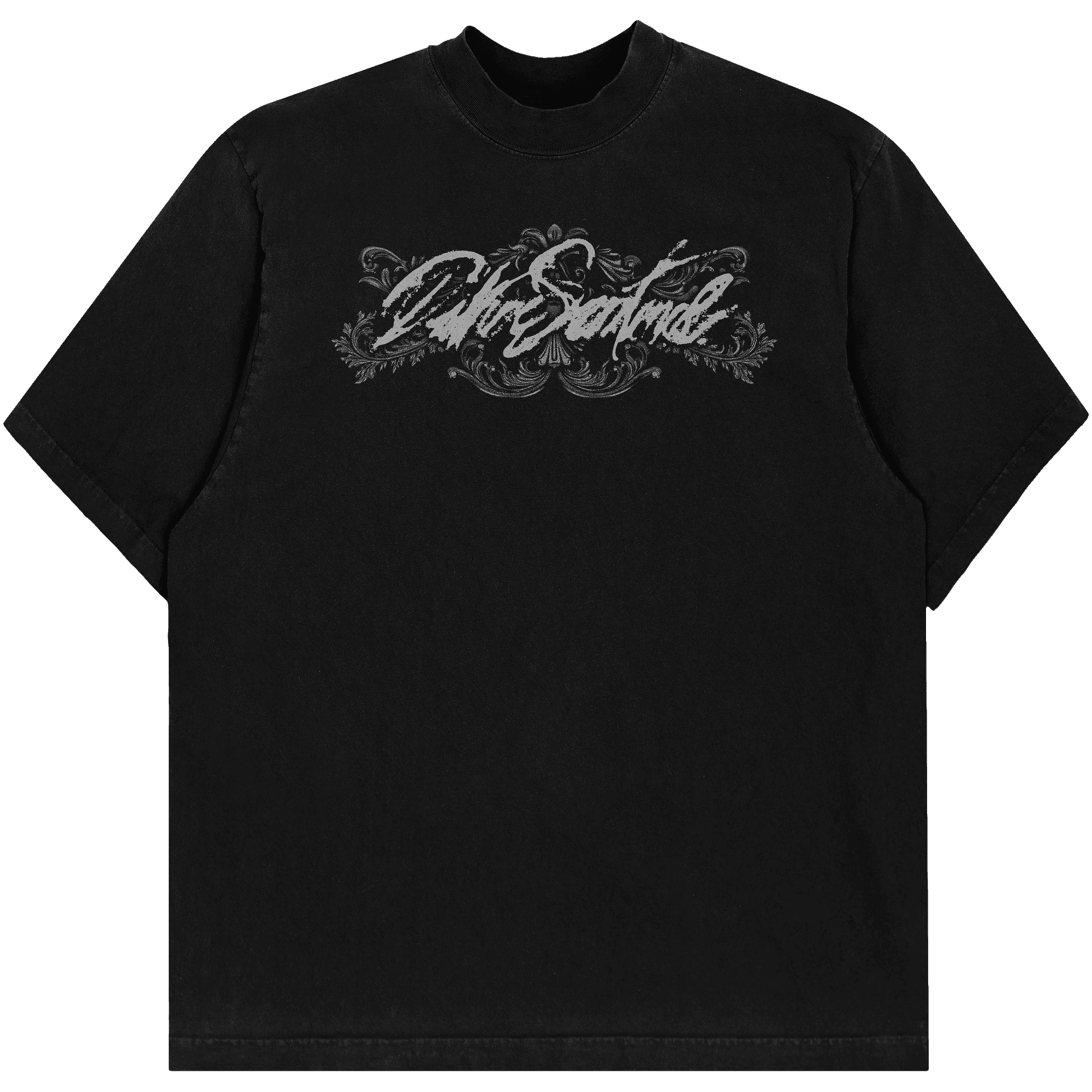 This t-shirt design uses imagery from within the vinyl layout, inspired by the album cover I designed for them. Featuring a cracked and ornate mirror with a silhouette of a man and some inked script typography. The front print features their logo with a delicate combination of 18th-century ornate flares as a frame.