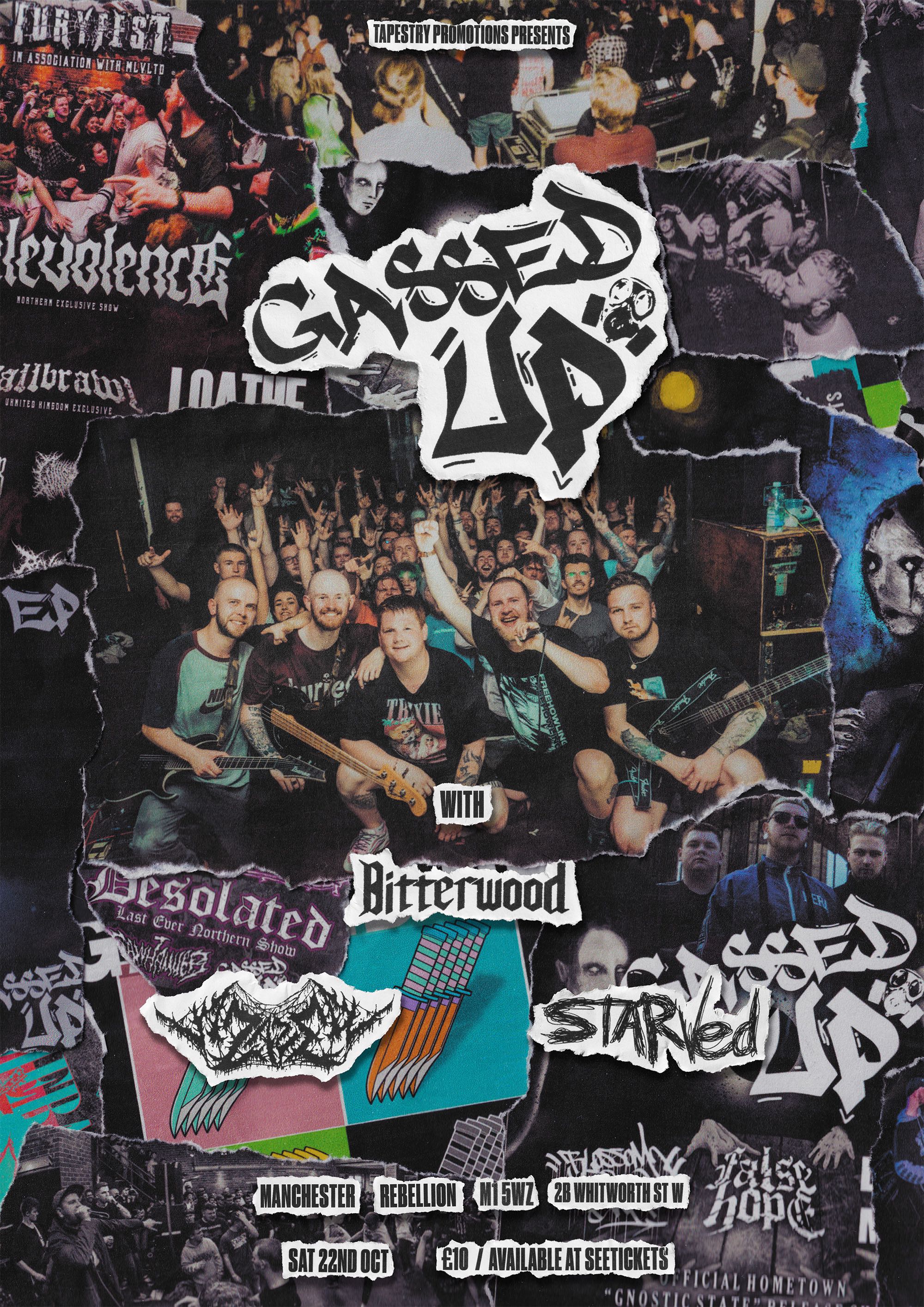 A farewell show poster for British beatdown band Gassed Up, featuring a physically made and scanned back in collage of all of their notable shows, releases, and moments.RIP Gassed Up 🕊️