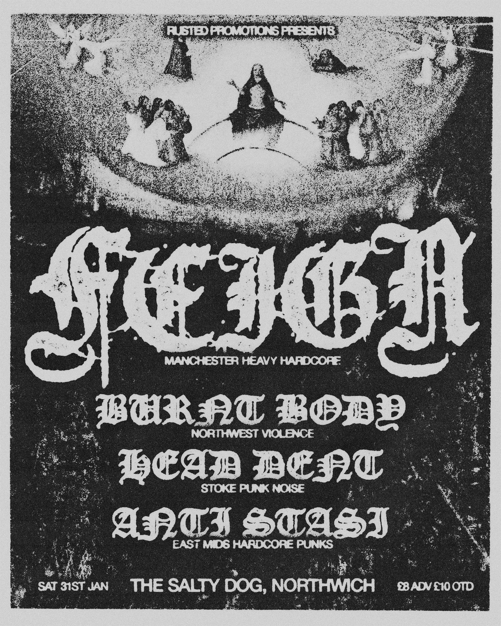 An event flyer for Rusted Promotions and their metal gig, using a requested painting by Hieronymus Bosch at Rusted's request.